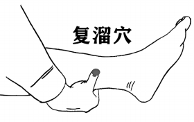按揉复溜穴 位于小腿内侧,脚内踝尖上两寸(三横指)处。按揉该穴位,有益气、除热、止汗的功效。