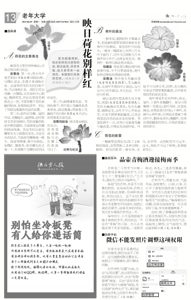 夏日酷暑难耐,却总有荷花迎骄阳而放,香远益清、亭亭净植,给大家带来一丝清凉。本期我们来画荷花吧。(摘编自《学苑创造·C版》) 荷花的主要画法 画荷花主要有两种画法:没骨法和没骨勾纹法。 没骨法 第一步:用大号羊毫笔加水(不能太稀)调湿白粉,与曙红混合,在碟子里调粉红色。注意保持笔肚处的白粉干净,不沾染粉红色。调好后笔尖再蘸一点胭脂,从花朵的中心画起,侧锋用笔,但此处要将笔稍微直立一些,不要将整个笔肚接触到纸面,免得颜色渗开。别忘了预留出莲蓬和花蕊的位置。 第二步:画外层花瓣。越到外层,花瓣越大,越舒展,此时要将毛笔更加倾斜,笔肚接触到纸面并稍加旋转,才能展现出花瓣的圆润饱满。在运笔时注意花瓣要有大小错落的变化,丰富花头的层次,不能将花瓣画成一般大。接着用稍重、稍干的颜色,如曙红、胭脂等,将花瓣尖再点染一下,形成整个花瓣自深到浅的变化。 第三步:画莲蓬和花蕊。等颜色稍干,用羊毫小笔蘸绿色或黄绿色,画出莲蓬;用狼毫小笔蘸较干的白粉(用墨也可)勾丝;再用藤黄点染花蕊。 没骨勾纹法 按没骨法画出花头后,再用墨或者胭脂勾出花瓣上的筋就可以了。 荷叶的画法 一般来说,植物的叶子数量众多,在绘画时需要安排好疏密关系和叶片的朝向。荷花的叶片比较大,一般在一幅画面上有两三片大叶子就行了,另外可以搭配几片未展开的小叶片,这样会更生动。画荷叶一般用勾填法和没骨法。 勾填法 用浓墨勾勒出荷叶轮廓和叶脉,半干后罩染绿色,使叶脉和边缘线有浸染的效果。 没骨法 用羊毫大笔蘸淡墨(或者用花青色调墨),笔尖蘸浓墨,从荷叶外围向中心画出,也可从中心往外画出,并无定法。半干时勾叶筋。 画正面荷叶要选用大号羊毫笔,用墨(或者花青色和墨调色),笔肚处蘸满淡花青色,笔头处蘸墨,侧锋运笔,从叶片中心开始运笔,中途不需要重新蘸墨,以求出现墨色自然的浓淡变化效果。等墨色稍干一点,再用小号狼毫笔蘸少量浓墨,中锋运笔来画叶脉。叶脉不可勾得太死,同样,在勾勒的中途也不需要重新蘸墨,让叶脉呈现自然的浓淡变化。 荷叶常见形状有四种:荷尖、卷叶、下垂叶及侧翻叶。荷尖可用侧锋一笔画出;卷叶用浓、淡墨色画出,再用浓墨勾叶脉;下垂叶,先画中心和叶脉,后用浓淡墨画下垂的叶片,整体如伞状;侧翻叶,先用淡墨画翻卷的部分,后用浓墨画正面的部分。 荷花的配景 一幅画要显得生动,除了主体物的描绘,还要搭配上各种动物、植物。荷花的配景一般有鱼、水鸟、水草等。这些配景不可过多、过大,颜色不可过于鲜艳,免得喧宾夺主。