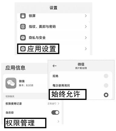 日常大家是不是遇到过这样的情况:微信发送不了照片。这可能跟权限设置有关,按照以下步骤操作,即可解决问题。 打开手机“设置”页面,点击“应用设置”,在应用列表中找到微信并打开,点击“权限管理”按钮。点击“读写手机存储”/“照片与视频”按钮,然后选择“始终允许”后,微信就能读写手机上的照片和文件,并进行发送了。(文/纪晓)