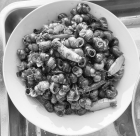 首先,选野生田螺放入清水养三五日,最好还放点金属及生姜,每日换水,促其更快吐出体内泥沙污物。接着,将田螺外壳洗刷干净,先焯水,再倒清水冷却,除去盖板及尾部——预防体内潴留排泄物,也便于入味及食用。处理完毕,再次用大火煮,建议不少于15分钟,彻底清除寄生虫隐患。捞出沥干后,拌入油盐及辣椒、紫苏、生姜葱蒜、酱醋料酒等,待其入味,即可端上餐桌了。
