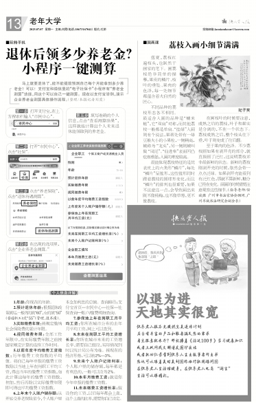 马上就要退休了,能不能提前预测自己每个月能拿到多少养老金?可以!支付宝和微信里的“电子社保卡”小程序有“养老金测算”功能,用这个可以自己一键测算。现在以支付宝举例,演示企业养老金测算具体操作流程。(整理/本报记者刘霞) 第一步 打开支付宝,在上方搜索栏输入“市民中心”。 第二步 打开“市民中心”,点击“社保”。 第三步 点击“养老保险”,点击“退休待遇测算”。 第四步 在出现的选项里,点击“企业养老金测算。” 第五步 填写准确的个人信息,点击“查看测算结果”,这样就能计算出个人未来退休能领取到的养老金。 【个人信息详解】 1.年龄:你现在的年龄。 2.预计退休年龄:根据退休政策填写,一般男的填“60”,女的填“50”(普通职工)或“55”(管理、技术岗)。 3.实际缴费年限:按规定缴纳社会保险费的累计年限。 4.视同缴费年限:全部工作年限中,在实际缴费年限之前按国家规定计算的连续工作时间。 5.以前年度平均缴费工资指数:历年缴费工资指数的平均值。将自己每年申报的缴费工资数除以当地上年在岗职工平均工资,得出当年的缴费工资指数,如此计算出每年的缴费工资指数,相加,然后再除以实际缴费年限即可得出平均缴费工资指数。 6.上年末个人账户储存额:从开始交养老保险至今,个人账户里本金加利息的总额。查询路径:支付宝首页—市民中心—社保—社保查询—账户/缴费明细查询。 7.参保地上年在岗职工月平均工资:你所在城市公布的去年月平均工资,网上可以查到。 8.未来在岗职工平均工资增长率:你所在城市未来的工资增长率,需要自己假设,实际情况到时以统计局公布为准。按现在的经济形势,可以填2%—3%。 9.未来个人账户记账利率:个人账户里的储存额,每年都是有利息的,一般可以设为2%。 10.本年月缴费工资:就是你今年申报的缴费工资数。 11.未来缴费工资增长率:假设你的工资,以后每年都会上涨,这个上涨的比率,需要你自己设定。